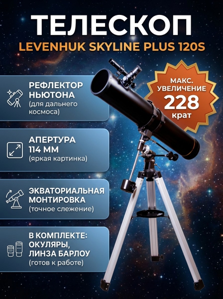 Телескоп на штативе Levenhuk Skyline PLUS 120S - БрендСтрана бренда: США Премиальность бренда:Телескоп на штативе Levenhuk Skyline PLUS 120S - Характеристики