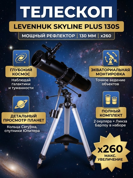 Телескоп на штативе Levenhuk Skyline PLUS 130S - ОписаниеLevenhuk Skyline PLUS 130S – телескоп, который откроет вам красоты ближнего и дальнего космоса. Лучше всего он проявляет себя при изучении галактик, двойных и одинарных звезд, туманностей, шаровых и рассеянных скоплений, но хорошо работает и по планетам Солнечной системы, и по Луне.