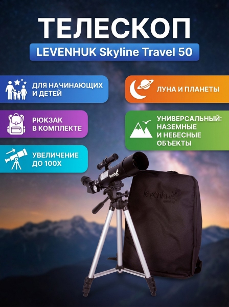 Levenhuk Skyline Travel 50 станет настоящей находкой для путешественника – он легкий и компактный, а в комплект входит рюкзак для перевозки.