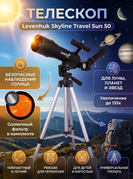Телескоп на штативе Levenhuk Skyline Travel Sun 50 - ОписаниеLevenhuk Skyline Travel Sun 50 – универсальный телескоп для путешествий и прогулок. Компактный рефрактор подойдет начинающим астрономам любого возраста.