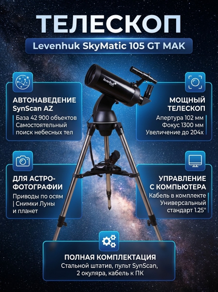 Телескоп с автонаведением Levenhuk SkyMatic 105 GT MAK - ДоставкаДоставка по Москве: бесплатно, 1-2 дняДоставка по Санкт-Петербургу: бесплатно, 2-3 дня Доставка по России: стоимость уточняйте у оператора. Телескоп с автонаведением Levenhuk SkyMatic 105 GT MAK - Отзывы0.0