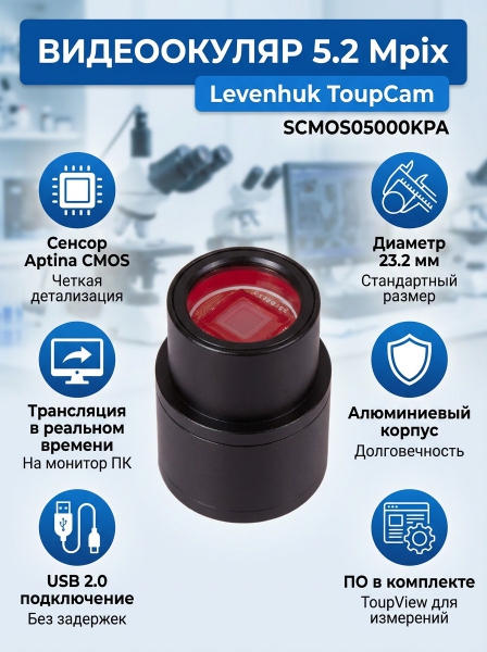 Видеоокуляр Levenhuk ToupCam 5,2 Мпикс (SCMOS05000KPA) - ОписаниеВидеоокуляр ToupCam 5,2 Мпикс – приспособление для передачи увеличенного микроскопом изображения на компьютерный экран через кабель интерфейса USB 2.0. Картинка транслируется в режиме реального времени, что может быть особенно актуально для групповых учебных занятий или коллективных медицинских обсуждений. Можно снять на видео весь процесс микроскопического исследования или зафиксировать его основные результаты в формате фотографий. Для редактирования полученных кадров можно использовать компьютерную программу ToupView с большим набором функций: масштабирование картинки, определение размера объектов, настройка яркости и других параметров. Установочный компакт-диск поставляется вместе с окуляром. Аксессуар имеет CMOS-сенсор, за счет чего потребляет сравнительно мало электроэнергии, обладает небольшими габаритами и производит качественную цифровую обработку изображения. Уберечь матрицу от повреждений помогает встроенный ИК-фильтр, который отсекает нежелательное инфракрасное излучение. Фильтр успешно справляется и с другой задачей – предотвращает искажение цветового баланса картинки. Корпус видеоокуляра сделан из алюминиевого сплава. Посадочный диаметр аксессуара равен 23,2 мм, для его установки в окулярный узел диаметром 30 или 30,5 мм потребуется купить соответствующий адаптер.