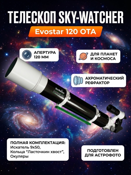 Труба оптическая Sky-Watcher Evostar 120 OTA - ОписаниеОптическая труба Sky-Watcher Evostar 120 OTA – это ахроматический рефрактор для наблюдений за космическими и наземными объектами. Благодаря двухэлементной оптической конструкции с воздушным зазором в передаваемой картинке практически отсутствуют искажения, все видно четко и ясно даже на предельном увеличении.