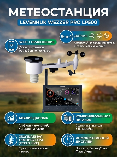 Метеостанция Levenhuk Wezzer PRO LP500 – это инструмент для профессионального наблюдения за погодой и микроклиматом в помещении, который можно приобрети и для бытового применения: станция отличается простым управлением и удобным дизайном. Основной модуль метеостанции устанавливается в помещении и работает от сети, а выносной радиодатчик «9 в 1», работающий от батареек и дополнительной встроенной солнечной панели, располагается на улице. Солнечная панель применяется только для непосредственного питания, она не может заряжать аккумуляторы.