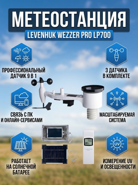 Levenhuk Wezzer PRO LP700 — это высокотехнологичная профессиональная метеостанция для удалённого контроля погодных и атмосферных условий как внутри помещений, так и на улице. Прибор оснащён двумя датчиками (внутренним и наружным), при этом внешнего дисплея нет — настройка и управление ведутся посредством бесплатного ПО Weather Logger на ПК.