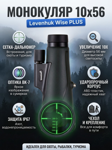 Монокуляр Levenhuk Wise PLUS 10x56 с сеткой - БрендСтрана бренда: США Премиальность бренда:Посмотреть все оптические монокуляры для охоты и рыбалки Levenhuk (6) Монокуляр Levenhuk Wise PLUS 10x56 с сеткой - Характеристики