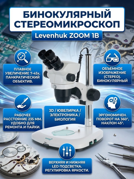Микроскоп бинокулярный Levenhuk ZOOM 1B - ОписаниеБинокулярный стереоскопический микроскоп Levenhuk ZOOM 1B можно использовать для изучения крупных образцов любой степени прозрачности. Он позволяет использовать и проходящий, и отраженный свет в наблюдениях по методу светлого поля. Микроскоп хорошо подойдет для профессиональной работы часового мастера, ювелира, геолога, зоолога, ботаника, филателиста, нумизмата. Благодаря простоте управления микроскоп можно использовать и для любительских исследований.