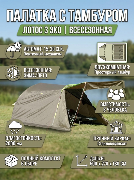 Палатка с тамбуром Лотос 3 Эко (19027) - БрендСтрана бренда: Россия Страна производства: Россия Премиальность бренда:Палатка с тамбуром Лотос 3 Эко (19027) - Характеристики