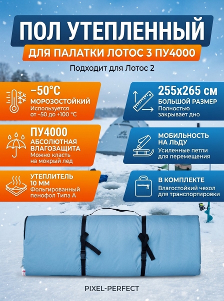 Пол утепленный Лотос 3 ПУ4000 (4007) - ОписаниеПол утепленный Лотос 3 ПУ4000 предназначен для палаток собранных на стандартных каркасах «Лотос 3» и «Лотос 2». Пол имеет пятигранную форму и покрывает всю поверхность дна палатки. Утепленный пол крепится изнутри клевантами (пуговицами)/крючками к специальным петлям, расположенным по углам палатки, накрывая внутреннюю юбку палатки и предотвращая задувание ветра снизу.