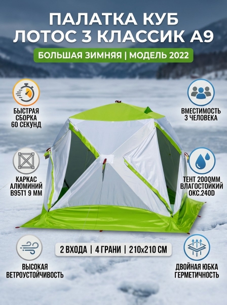 Зимняя палатка Лотос Куб 3 Классик А9 2022 - ОписаниеЛотос Куб 3 Классик А9 (модель 2022) - полуавтоматическая палатка куб для зимней рыбалки. На палатке установлен каркас с дугами из высокопрочного алюминиевого сплава В95Т1 диаметром 9 мм. Каркас палатки оснащен усиленным «хабом» (механизмом раскрытия), изготовленным из полиамида.