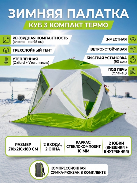 Утепленная зимняя палатка Лотос Куб 3 Компакт Термо - ОписаниеЛотос куб 3 Компакт Термо – самая компактная полуавтоматическая палатка куб для зимней рыбалки с системой теплоизоляции тента. Тент состоит из трех слоев материала сшитых между собой по периметру деталей тента: верхний слой – ветровлагозащитная ткань повышенной плотности Polyester Oxford 300D WR, промежуточный слой – нетканое полотно из высокотехнологичного теплоизоляционного ворсистого материала, нижний слой - влагозащитная ткань Polyester Oxford 210D.