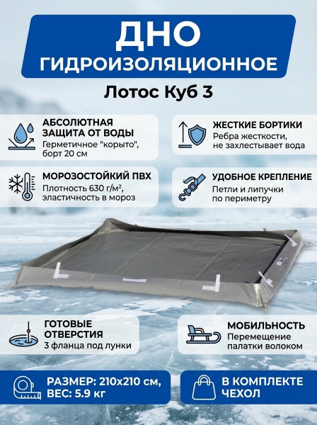 Дно гидроизоляционное Лотос Куб 3 с отверстиями под лунки (с фланцами) - ОписаниеДно гидроизоляционное Лотос Куб 3-900 (210х210) с 3 лунками (в сборе с фланцами). Дно изготовлено из цельнокроеного прочного морозостойкого материала ПВХ плотностью 630 г/м². Небольшой вес (5.9 кг) и компактный размер в сложенном виде позволяют укладывать гидродно в сумку вместе с палаткой.