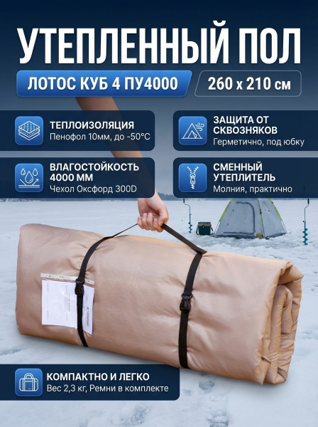 Пол утепленный Лотос Куб 4 ПУ4000 изготовлен из прочных материалов, имеющих рабочий диапазон температур от –50 °С до +100 °С. Материал пола «не боится» критических перегибов на морозе, что позволяет смело подгибать края пола при эксплуатации и компактно сворачивать его при отрицательной температуре.