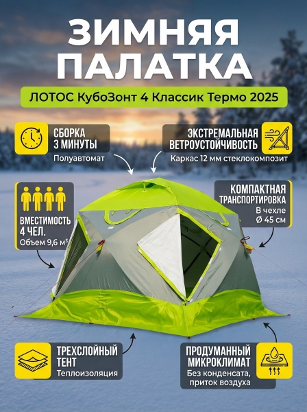 Зимняя палатка Лотос КубоЗонт 4 Классик Термо 2025 - ОписаниеЛОТОС КубоЗонт 4 Термо – большая трехслойная зимняя палатка кубозонт с полуавтоматической системой раскрытия. Высокое, теплое укрытие, имеющее монолитную устойчивость от ветра, надежную защиту от непогоды и максимально-богатое оснащение как для зимней рыбалки, так и для проживания на природе круглый год, позволит Вам почувствовать полноценный домашний комфорт даже в экстремальных погодных условиях!