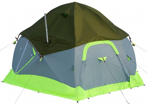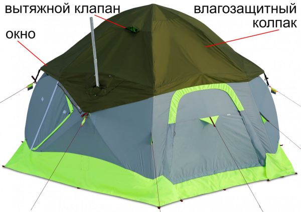 Дублируя вытяжной клапан в макушке палатки и все четыре окошка, колпак образует защитные козырьки для окон, обеспечивает влагозащиту клапанов отопительной трубы, защищает верхний стык Д-образной двери, а также формирует защитную планку для съемной распашной двери. Процесс раскрытия и складывания палатки производится вместе с колпаком.