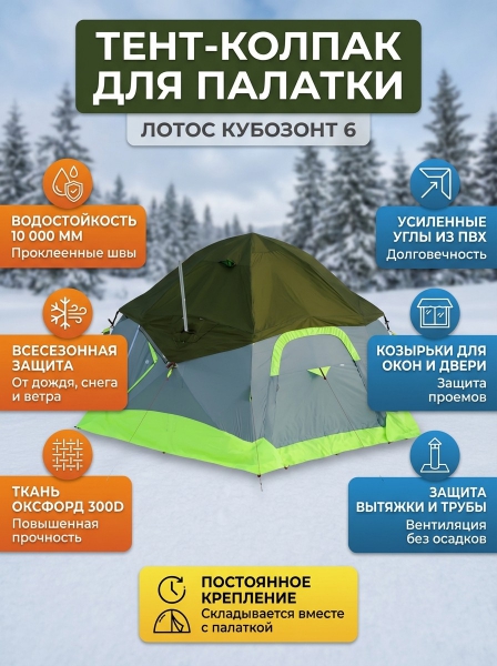 Влагозащитный колпак Лотос КубоЗонт 6 - ОписаниеЗащита зимней палатки ЛОТОС КубоЗонт 6 от дождя и мокрого снега обеспечивается при помощи влагозащитного колпака, который крепится на куполе палатки. Влагозащитный колпак выполнен из прочной высококачественной ткани полиэстер Оксфорд. Швы колпака проклеены герметизирующей лентой.