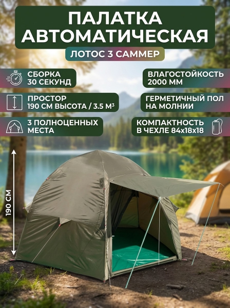 Палатка Лотос Лотос 3 Саммер - ОписаниеЛОТОС 3 Саммер - летняя палатка с автоматической системой раскрытия, надежной и удобной конструкцией, подарит отдыхающим на природе максимум удовольствия. Высокое и просторное укрытие рассчитано на эксплуатацию как в летнее, так и в межсезонное время года в качестве кемпинговой палатки, а компактная упаковка и малый вес позволят применять его в качестве туристической палатки во время кратковременных пеших походов или сплавов по рекам.