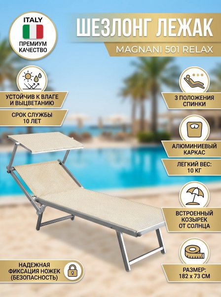 Шезлонг-лежак металлический Magnani 501 Relax - ОписаниеШезлонг 501 (Relax) характеризуется своей необыкновенной легкостью и отличным соотношением качество/цена. Алюминиевый профиль (перекладина), соединяющий две ножки, толщиной 18 мм, делает шезлонг легким и удобным для использования на пляже, а также на площадках возле бассейна и в садах. От модели 500 (Eccentrico) отличается тем, что имеет распорку на каркасе, которая фиксирует ножки, чтобы избежать риска травмирования рук, вызванных случайным закрытием.