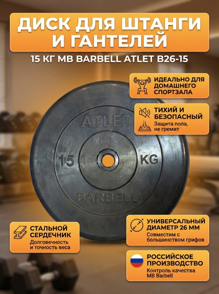 Диск обрезиненный MB Barbell MB-AtletB26-15 - БрендMB Barbell – это торговая марка, представляющая специализированное и высококачественное оборудование для оснащения спортивных залов.