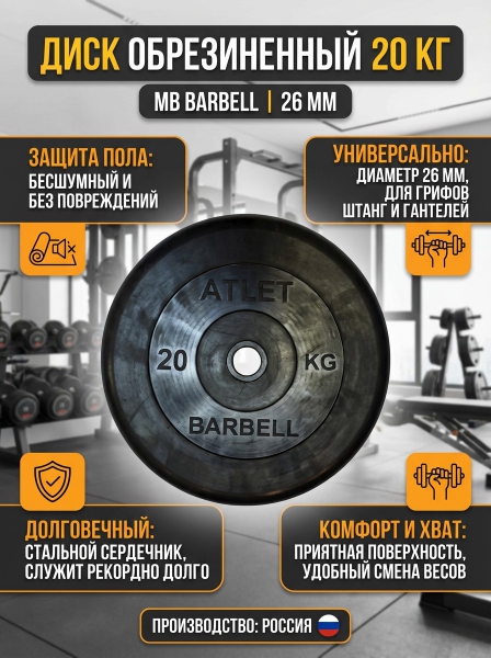 Диск обрезиненный для штанги MB Barbell MB-AtletB26-20 - БрендMB Barbell – это торговая марка, представляющая специализированное и высококачественное оборудование для оснащения спортивных залов.