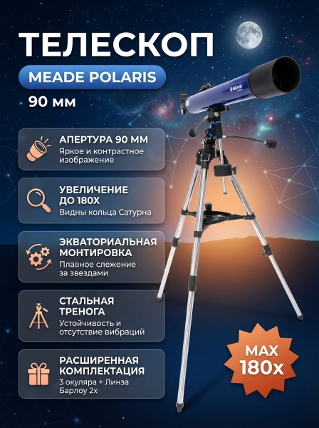 Телескоп рефракторный Meade Polaris 90 мм - ОписаниеРефрактор Meade Polaris 90 мм – это идеальный инструмент для наблюдения Луны и планет Солнечной системы. Светосильный объектив диаметром 90 мм позволяет увидеть фазы Меркурия и Венеры, спутники Сатурна, Большое Красное Пятно Юпитера и множество других объектов.