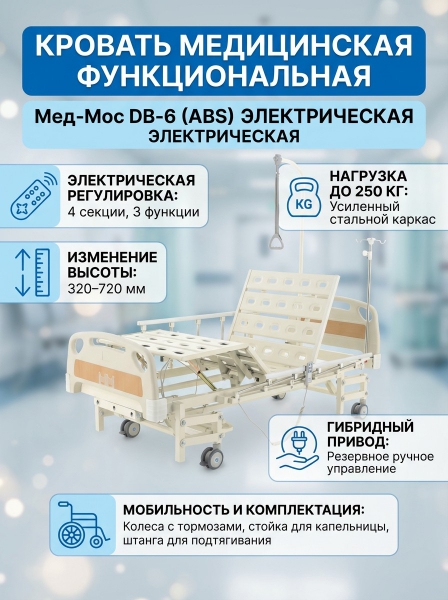 Кровать медицинская функциональная Мед-Мос DB-6 (ABS) с электрическим приводом - ОписаниеКровать функциональная медицинская DB-6 предназначена для ухода за пациентами в стационарных, реанимационных отделениях и домашних условиях. Она обеспечивает комфортное размещение пациента в различных положениях и поддерживает выполнение медицинских процедур. Ложе кровати состоит из нескольких подвижных секций, регулируемых с помощью электрических приводов.