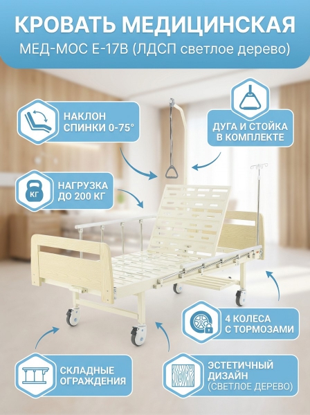 Кровать механическая Мед-Мос E-17B (ЛДСП светлое дерево) - БрендПремиальность бренда:Посмотреть все функциональные медицинские кровати Мед-Мос (56) Кровать механическая Мед-Мос E-17B (ЛДСП светлое дерево) - Характеристики
