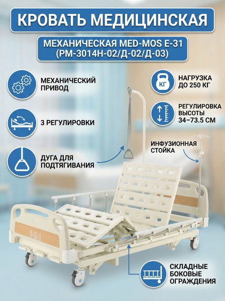 Кровать механическая Мед-Мос E-31 (РМ-3014Н-02/Д-02/Д-03) - ДоставкаДоставка по Москве: бесплатно, 1-2 дняДоставка по Санкт-Петербургу: бесплатно, 2-3 дня Доставка по России: стоимость уточняйте у оператора. Кровать механическая Мед-Мос E-31 (РМ-3014Н-02/Д-02/Д-03) - Отзывы0.0