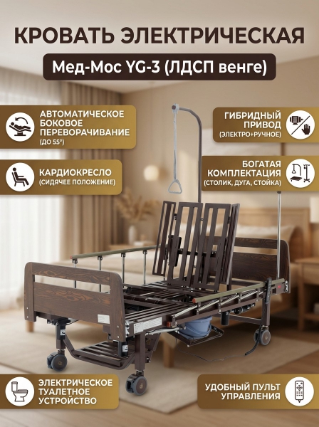 Кровать электрическая Мед-Мос YG-3 (ЛДСП венге) - ОписаниеМедицинская функциональная кровать Med-Mos YG-3 — это современное решение для ухода за пациентами. Электрическая модель с боковым переворачиванием, противопролежневой функцией, туалетным устройством и функцией «кардиокресло». Кровать выполнена в стильном дизайне с отделкой ЛДСП венге, что делает её не только практичной, но и эстетически привлекательной.