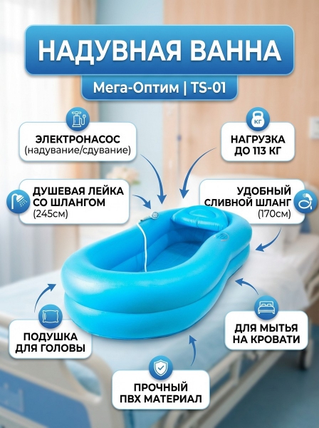 Надувная ванна для мытья на кровати Мега-Оптим TS-01 - ОписаниеЕсли существует необходимость ухода за лежачими больными – используйте специальную ванну TS-01. Она создана для проведения санитарных процедур для больных, находящимися на строгом постельном режиме.