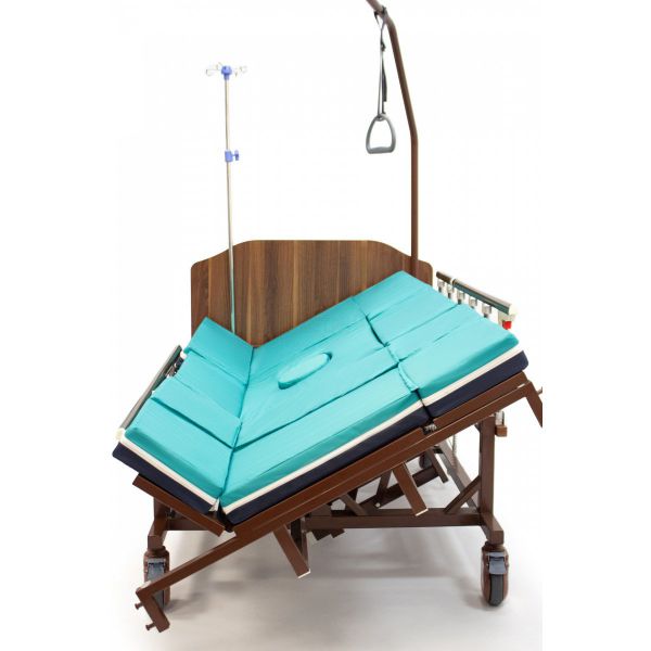 Медицинская кровать с механизмом переворачивания, снабжённым таймером и позволяющим ночную смену положения больного без контроля ухаживающего лица, полноценным положением кардио-кресло, опускающим все ножные сегменты к полу и электроприводным санитарным оснащением, которое при определённой сохранности моторных функций пациента обеспечит ему максимальную автономность. без, в любом случае, действующей на нервы помощи ухаживающих лиц.