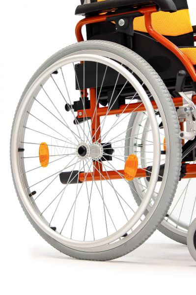 Коляска оснащена пневматическими колесами, обеспечивающими плавный ход и амортизацию на неровных поверхностях. Во время остановки коляска надежно фиксируется боковыми стояночными тормозами.