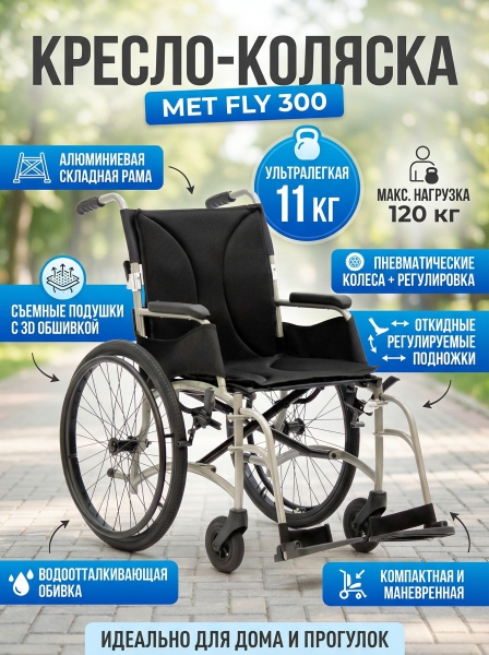 Кресло-коляска MET FLY 300 - ОписаниеСамая лёгкая механическая Кресло-коляска MET FLY для инвалидов с сиденьем из чёрного полиэстера, алюминиевой рамой, вес коляски всего 11 кг. Инвалидное кресло-коляска с простым и выверенным функционалом, применимо как домашнее кресло-коляска так и в условиях медицинского стационара. Сиденье из водоотталкивающего полиэстера чёрного цвета, откидные подножки обеспечат удобство передислокаций и нахождения в кресле.