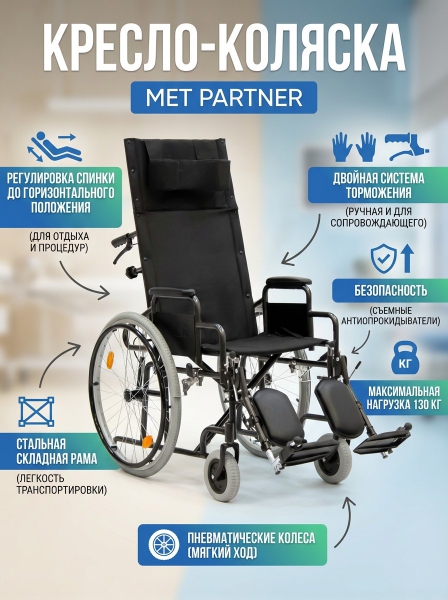 Кресло-коляска MET PARTNER - ОписаниеMET PARTNER – механическая инвалидная коляска пассивного типа, разработанная для комфортного передвижения и отдыха.