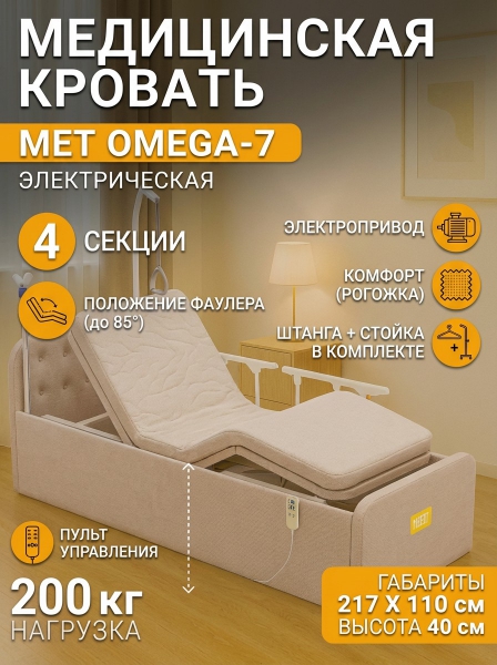 Медицинская кровать MET OMEGA-7 - ОписаниеOMEGA-7 – это медицинская четырехсекционная кровать с электроприводом. Модель разработана для комфортного использования пожилыми людьми и пациентами — как в домашних условиях, так и в специализированных учреждениях.