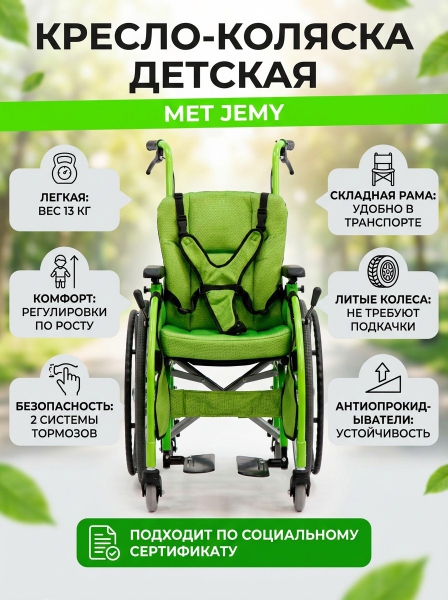 Кресло-коляска MET JEMY - ОписаниеМеханическая инвалидная коляска Jemy — это модель, созданная специально для детей. Она дает возможность ребенку передвигаться самостоятельно или с помощью сопровождающего. Модель подходит для использования как внутри помещений, так и на улице. Коляска способна выдерживать вес до 75 килограммов.