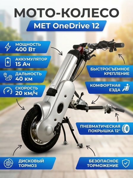Мото-колесом для механической складной коляски MET OneDrive 12 (18553) - Описание12-дюймовое мото-колесо с дисковым тормозом и рулём мотоциклетного типа MET OneDrive 12. Электроприводное мото-колесо, которое сделает из Вашей кресло-коляски полноценный трицикл для дальних поездок без посторонней помощи. Быстросъёмное крепление к подножкам Вашего кресла коляски, которое позволяет устанавливать и снимать его с кресла коляски собственными силами и не сходя с кресла-коляски.