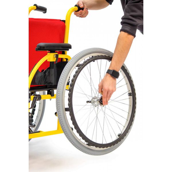 Задние колеса являются пневматическими, а передние литые. Во время остановки коляска надежно фиксируется боковыми стояночными тормозами.