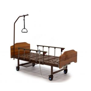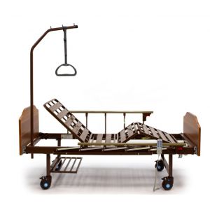 Дополнительная механическая фиксация икроножной секции с помощью двух растоматов. Боковые ограждения (2шт) выполнены из алюминия и легко опускаются, обеспечивая быстрый доступ к пациенту. Основание кровати выполнено из стали, покрыто ударопрочной эпоксидной эмалью.
