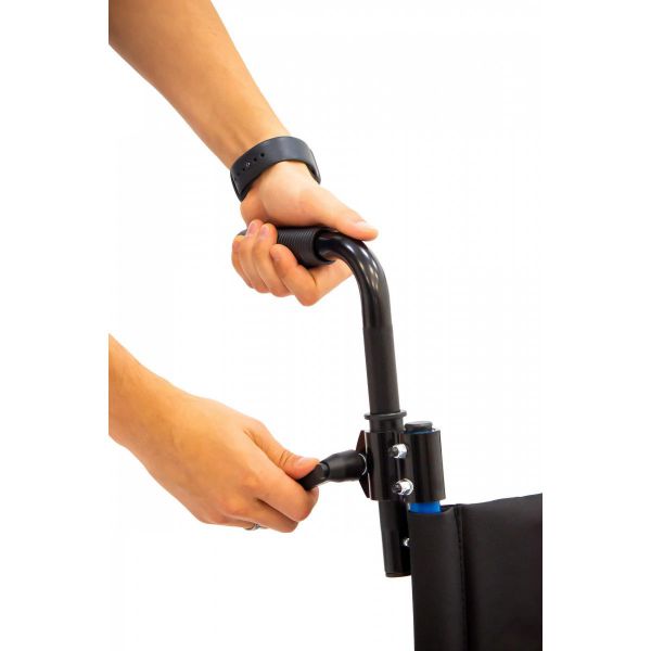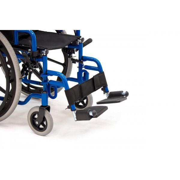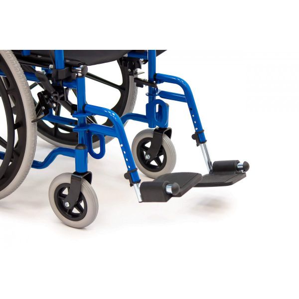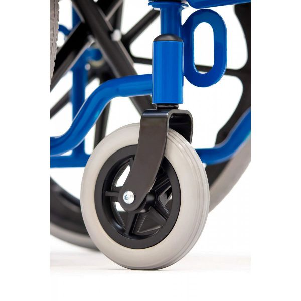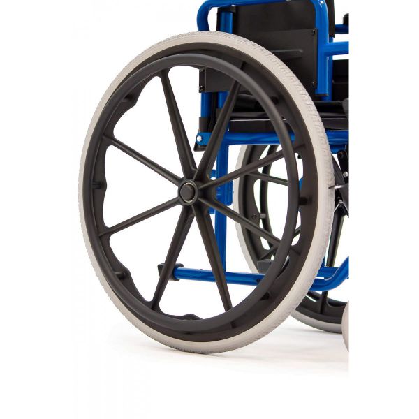 Сиденье и спинка выполнены из нейлона, который сочетает в себе высокую износостойкость и простоту в обслуживании. Коляска оснащена литыми колёсами: они прочные, долговечные и не требуют обслуживания. Во время остановки коляска надежно фиксируется боковыми стояночными тормозами.