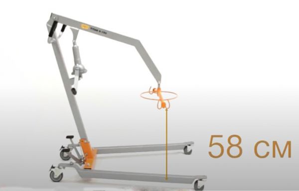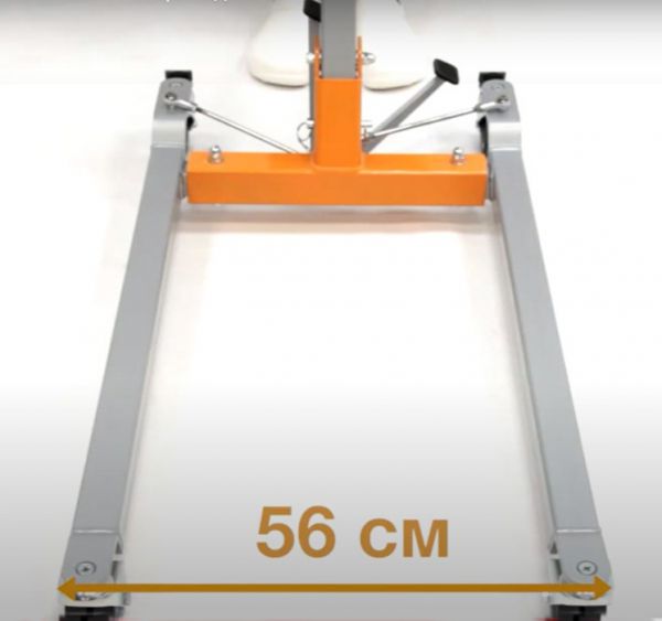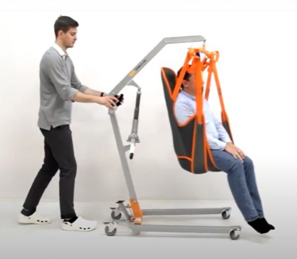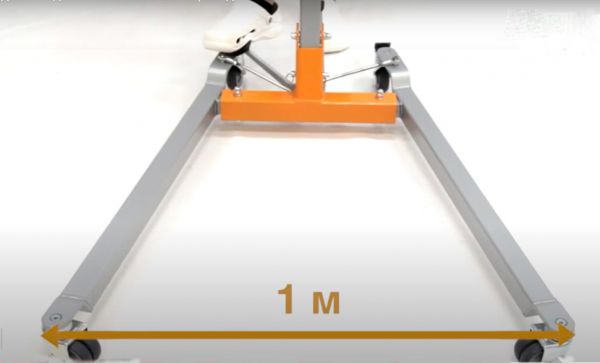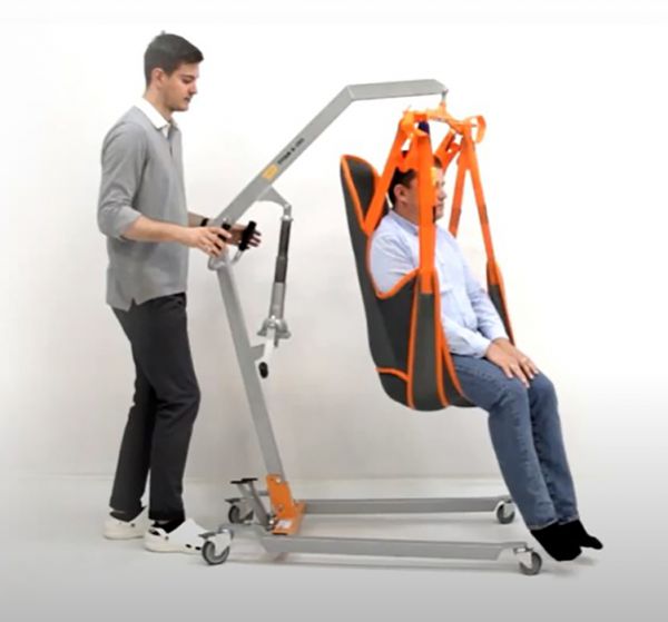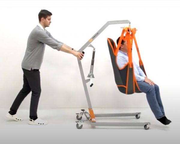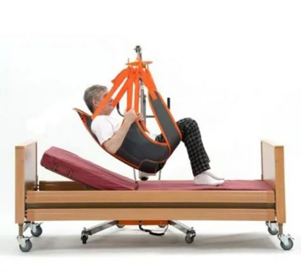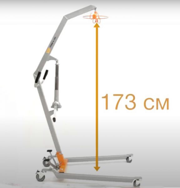 Опоры подъемника раздвигаются, что создает дополнительную устойчивость. Подъемник с опорами на колесиках подъезжает вплотную к мебели. Подвеска - перевязь является универсальной.