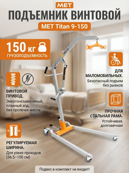 Подъемник узкий с винтовым приводом MET Titan 9-150 (15335) - ОписаниеПодъемник для больных и инвалидов TITAN 9-150 представляет собой модель с механическим приводом.