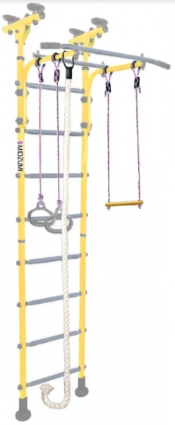 В данной модели высота регулируется в пределах 240-290 см. Этого хватит для надежной установки в квартирах со стандартной высотой потолка. Для безопасности юных спортсменов перекладины лестницы имеют прорезиненное покрытие. Конструкция оснащена базовыми спортивными снарядами (кольца, трапеция, канат, турник), чего вполне достаточно для веселого и полезного досуга детей. Прочная металлическая конструкция позволяет выдерживать до 100 кг. Крепление враспор прекрасно подойдет тем, кто не хочет портить обои и сверлить стены. Крепление враспор между полом и потолком надежно ни чуть не меньше крепления к стене, к тому же такой комплекс при необходимости можно легко перенести на другое место.