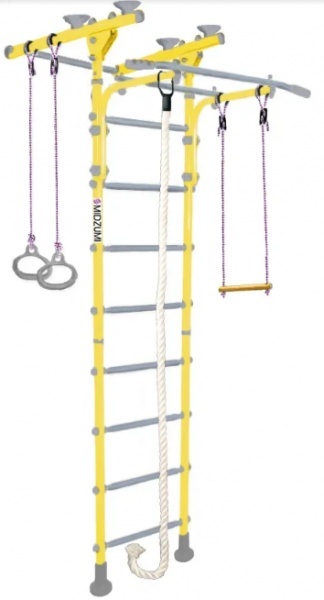 В комплект включены гимнастические кольца, канат и трапеция для тренировки разных груп мышц. Распорный способ крепления убережет стены от ответстий, но при этом установка невозможна в помещениях с натяжными потолками. Прочная металлическая конструкция позволяет выдерживать до 100 кг. Крепление враспор прекрасно подойдет тем, кто не хочет портить обои и сверлить стены. Крепление враспор между полом и потолком надежно ни чуть не меньше крепления к стене, к тому же такой комплекс при необходимости можно легко перенести на другое место.