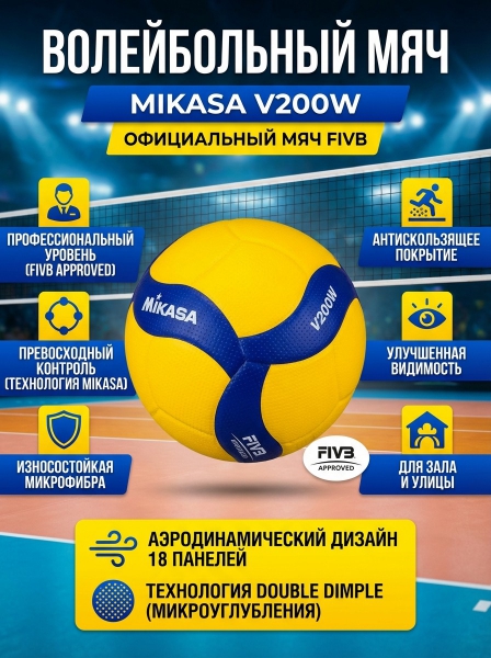 Мяч волейбольный Mikasa V200W р. 5 - ОписаниеНовый официальный мяч для классического волейбола V200W. FIVB "EXCLUSIVE" OFFICIAL GAME BALL. FIVB Approved. 16 ноября, 2018 года на 36 конгрессе FIVB в Мексике корпорация Mikasa представила новый мяч для классического волейбола V200W. Новая модель V200W — это сбалансированный, аэродинамический дизайн с 18 панелями. Новый яркий дизайн оптимизирует качество игры, улучшает контроль мяча и делает игру максимально зрелищной. V200W дебютирует на Кубке Мира по Волейболу FIVB 2019 в Японии. Мяч изготовлен из микрофибры с покрытием double-dimple, которое стабилизирует курс полета мяча и создает дополнительный контроль мяча. Новейшая технология “Nano Balloon Silica” препятствует тому, чтобы покрытие мяча становилось скользким во время интенсивной игры. Мяч тестировался на протяжении 6 месяцев профессиональными игроками национальных сборных и прошел все строгие протоколы тестирования, превысив стандарты подтверждения FIVB.