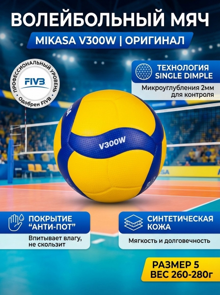 Мяч волейбольный Mikasa V300W р 5 - ОписаниеНовинка 2019 года - мяч V300W. Мяч пришел на замену знаменитому мячу MVA300. Выполнен из синтетической кожи на основе микрофибры, изготовлен с применением технологии «Single Dimple» (от англ. — углубление, ямка). Поверхность с небольшими углублениями с диаметром 2 мм и глубиной 0.2-0.3 мм. Сочетание нововведений в конструкции мяча обеспечивает мячу стабильную траекторию полета, высокий отскок при малой силе удара, большую площадь соприкосновения и максимальный контроль мяча. Мяч волейбольный V300W одобрен для проведения международных и национальных соревнований.