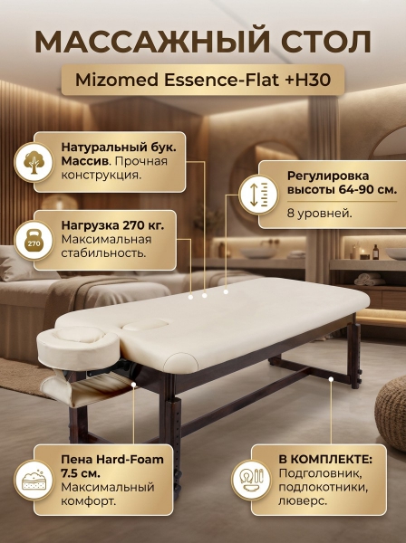 Массажный стол Mizomed Essence-Flat SEF3S30+H - ОписаниеСомневаетесь? - Посмотрите рейтинг ТОП-10 по категории «Столы для массажа»Массажный стационарный стол Essence-Flat +H30 - идеальный выбор для профессиональных массажных салонов и спа-центров. Произведенный из высококачественных материалов, он обеспечивает комфорт и удовольствие как для клиента, так и для специалиста. Стол имеет удобную регулируемую высоту, что позволяет адаптировать его под индивидуальные потребности каждого клиента. Благодаря своей эргономичности, стол позволит массажисту проводить процедуры с максимальным удобством и эффективностью. Наслаждайтесь качественным массажем с массажным стационарным столом Essence-Flat +H30