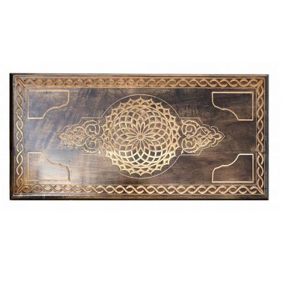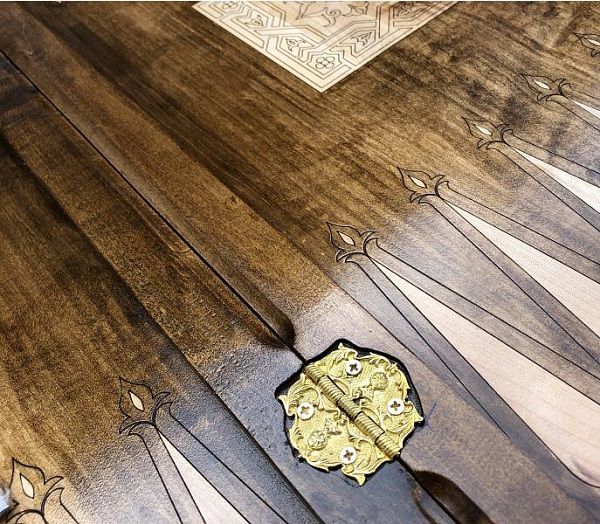 Верхняя крышка доски украшена резным изображением. На задней крышке нанесено шахматное поле, поэтому данную доску можно использовать и для игры в шашки или шахматы. Внутренняя часть представляет собой поле для нард, украшенное красивыми узорами.