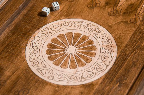 Для большей износостойкости изделие покрыто защитным лаком. Также долговечность доске, украшенной резным гербом Грузии, обеспечивает качественная медная фурнитура. На задней крышке доски нанесено шахматное поле, что позволяет использовать ее не только для нард, но и для игры в шашки или шахматы.