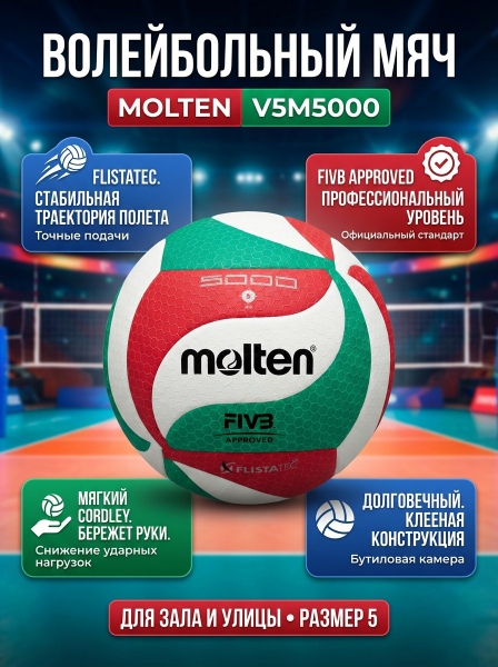 Мяч волейбольный Molten V5M5000 р.5 - ОписаниеВолейбольный тренировочный мяч из мягкой синтетической кожи (полиуретан Cordley), обычно используемой для мячей матчевого уровня Рекомендуется для спортивных секций, школ, любительских команд, а также для использования в общеобразовательных учреждениях и игры на отдыхе.